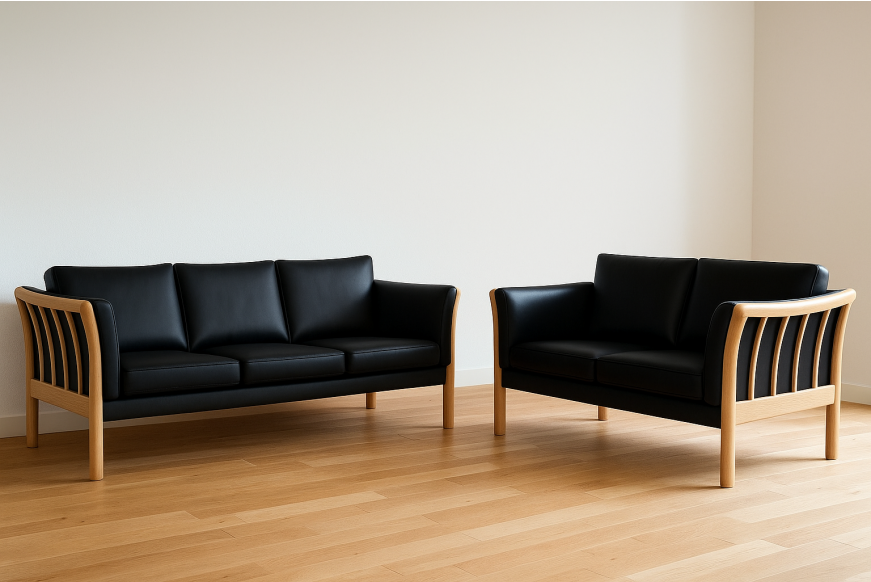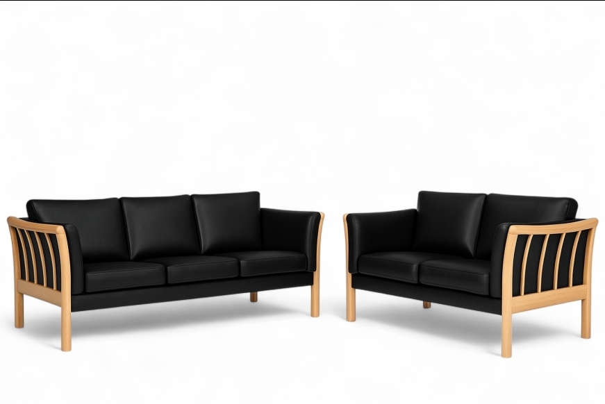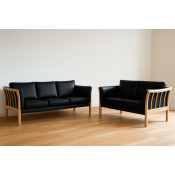 På billedet ses et 3 + 2 prs. Dorte sofasæt, med læderbetræk og med ubehandlet bøgetræs stel.