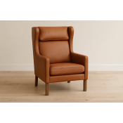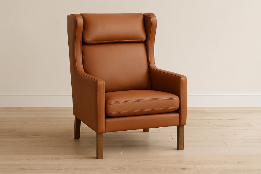 På billedet ses en øreklapstol i lækker 80 læder overalt. Med de klassiske keder syning. Med ubehandlede egetræsben.