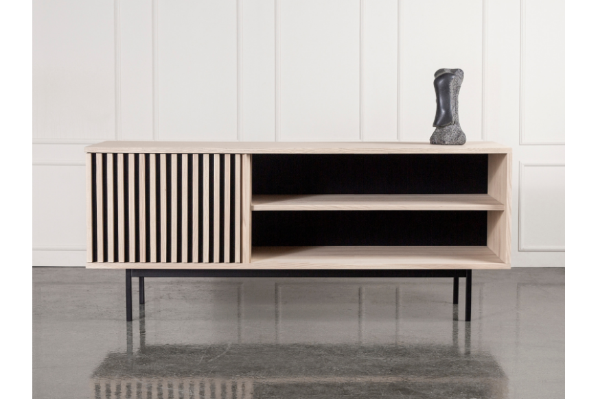 AKUSTIK SKÆNK fra Kristensen & Kristensen er designet med ønske om at forbedre akustikken i boligen samt opretholde et pænt udtryk. Kombinationen af trælameller og filt, er ikke blot tænkt ind i designet for at fornøje øjet, men i lige så høj grad for at absorbere rumklang. Skænken er vist her i massiv hvidolieret ask med sort metal sokkel.