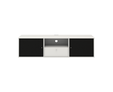 Let og elegant tv møbel i snehvid. Med stof klap i sort, som lyd og signal let går igennem. Samt 2 stk. skuffer.